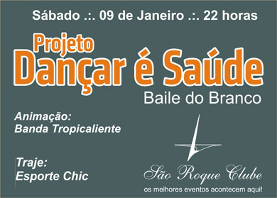 Para os amantes da boa música, informamos que o próximo baile do Projeto Dançar é Saúde, será no dia 9 de Janeiro. Esse será o Baile do Branco, onde é recomendado (não obrigatório) a utilização do branco em pelo menos uma peça da roupa.